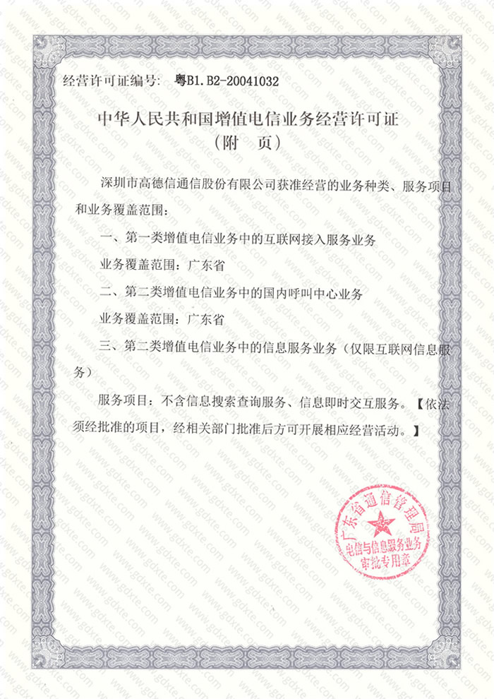 高德信拥有国家工业和信息化部颁发的:网络托管基础电信业务经营许可证,国内互联网虚拟专用网业务(VPN)、固定网国内数据传送业务、互联网接入服务业务(ISP)、互联网数据中心业务(IDC)等跨地区增值电信业务经营许可证。广东省通信管理局颁发的:互联网接入服务业务(ISP)、信息服务业务(ICP)、国内呼叫中心业务(Call Center)等增值电信业务经营许可证,同意高德信开展宽带接入网业务试点的批复。国家住房和城乡建设部颁发的:电子与智能化工程专业承包贰级资质证书。